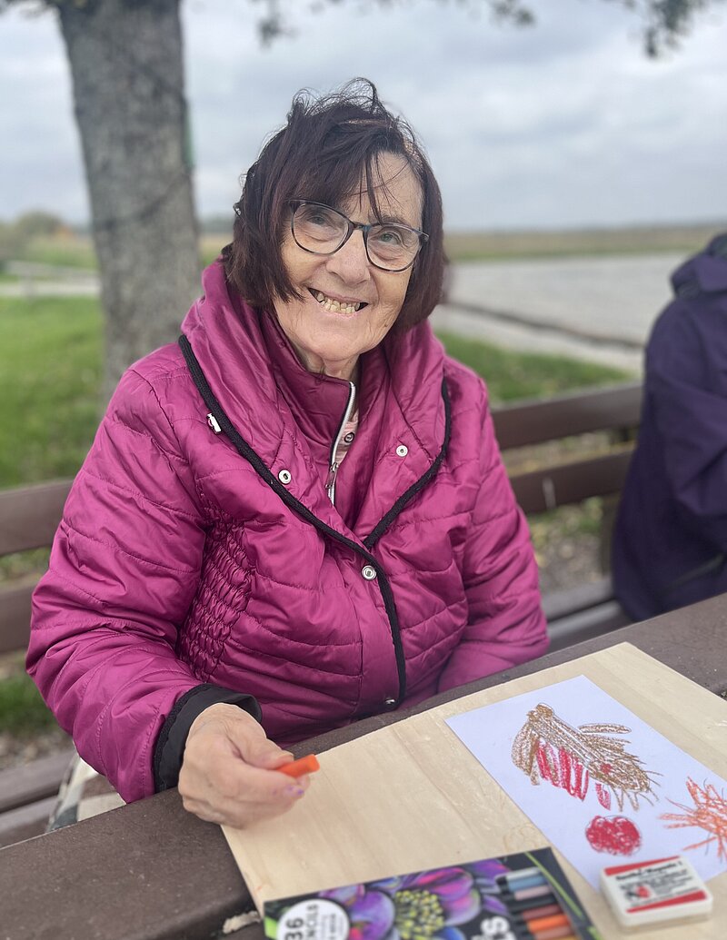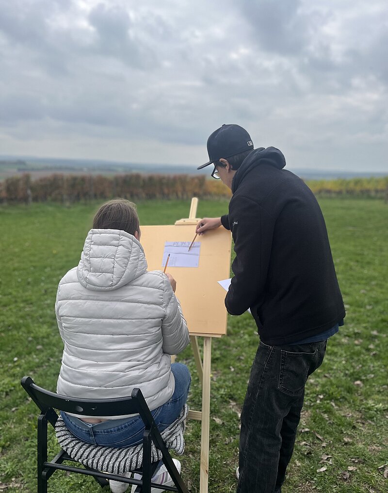 Am Samstag ging es für einige warm angezogene und malbegeisterte Bewohner*innen und Klient*innen zu einem ganz besonderen Ausflug mit dem Kulturbüro. Am Kobel – der berühmten Aussichtsplattform im Weinort Rimpar – haben wir uns mit dem Würzburger Künstler Philipp Rau getroffen, der uns in die Kunst des Panorama-Malens eingeführt hat. Ausgestattet mit Staffelei und Bleistift durfte sich jeder ein schönes Plätzchen suchen und versuchen das fränkische Weinland auf Papier zu bringen. Entstanden sind dabei tolle Kunstwerke, die alle zeigen, dass nicht nur wir als Menschen verschieden sind, sondern auch unser Blick auf die Welt! Malte der eine die weit entfernte Rimparer Kirche mit Häuschen außenrum, konzentrierte sich die andere auf die wogenden Hügel der Weinberge.