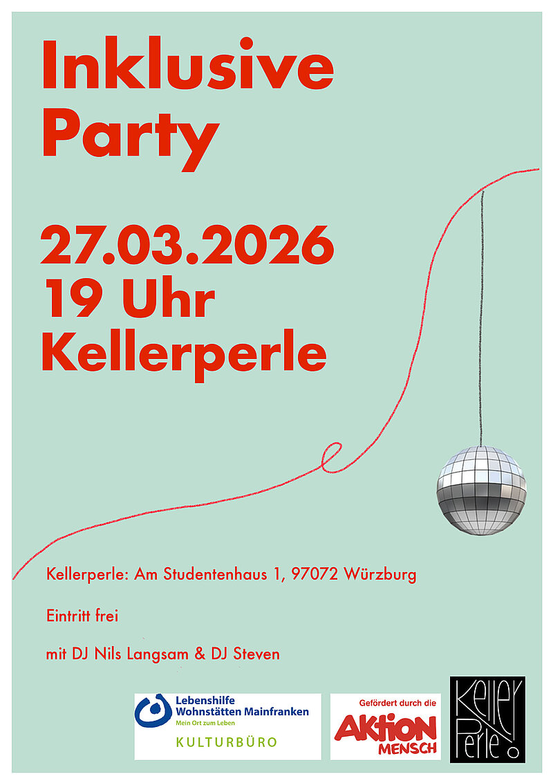 Das Kulturbüro der Lebenshilfe Wohnstätten Mainfranken lädt gemeinsam mit DJ Nils Langsam und DJ Steven zur Inklusiven Party am 27.03.2026 ab 19 Uhr in die Kellerperle in Würzburg ein.