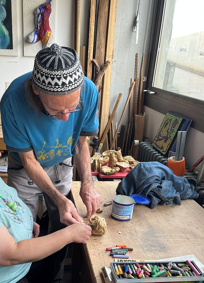 Nicht nur die Räumlichkeiten in der Würzburger Posthalle waren eindrücklich, auch Scherers teils lebensgroße Skulpturen stießen auf Begeisterung! Bei einer Vorstellungsrunde der besonderen Art sind alle miteinander ins Gespräch gekommen und konnten gleichzeitig kreativ werden. Jede Person hat ein Stück Ton bekommen, dass so lange nach den eigenen Vorstellungen geformt wurde, bis die nächste Person das Wort ergriffen hat. Dann wurde auch das Stück Ton im Kreis weitergegeben. So besaß am Ende jeder eine kleine Skulptur, an der die ganze Gruppe mitgearbeitet hatte!